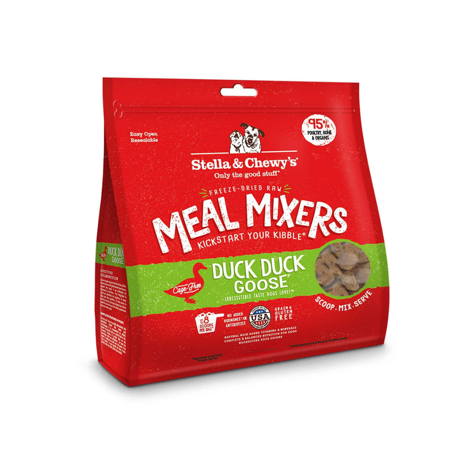 Kickstart your canine’s kibble with Stella & Chewy's Duck Duck Goose Meal Mixers Freeze-Dried Raw Dog Food Topper! Even the pickiest pups find it hard to resist the hand-crafted taste of this meal mixer. Just one scoop transforms everyday kibble into nutrient-packed raw nutrition. Made with 95% cage-free poultry, nutrient-rich organs, and bone, plus organic fruits and vegetables, this mixer delivers the benefits of raw food with the convenience of freeze-dried preparation. Each small batch is crafted with care in Stella & Chewy’s USA-based kitchen, ensuring the highest quality for your furry friend.