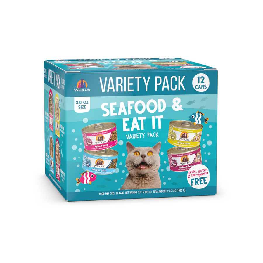 Weruva Classic Cat Seafood & Eat It! Variety Pack is a premium selection of sustainably sourced, grain-free wet cat food recipes. Featuring four delicious seafood flavors — Asian Fusion, Meow Luau, Mack and Jack, and Mideast Feast — each meal is crafted with high-quality, flaked fish loins to satisfy your cat's taste buds. Free of grain, gluten, and carrageenan, this variety pack offers complete and balanced nutrition for adult cats.