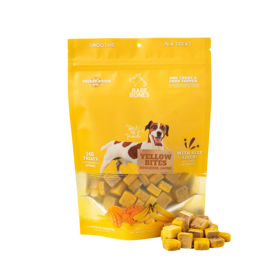 Give your pup a vibrant, nutrient-dense treat with Bare Bones Yellow Bites! These freeze-dried cubes combine 100% Canadian beef liver for high-quality protein with fiber and natural vitamins from wholesome fruits and vegetables. Packed with no fillers, grains, or additives, these treats provide a natural multivitamin boost while offering a delicious, crunchy texture dogs love.