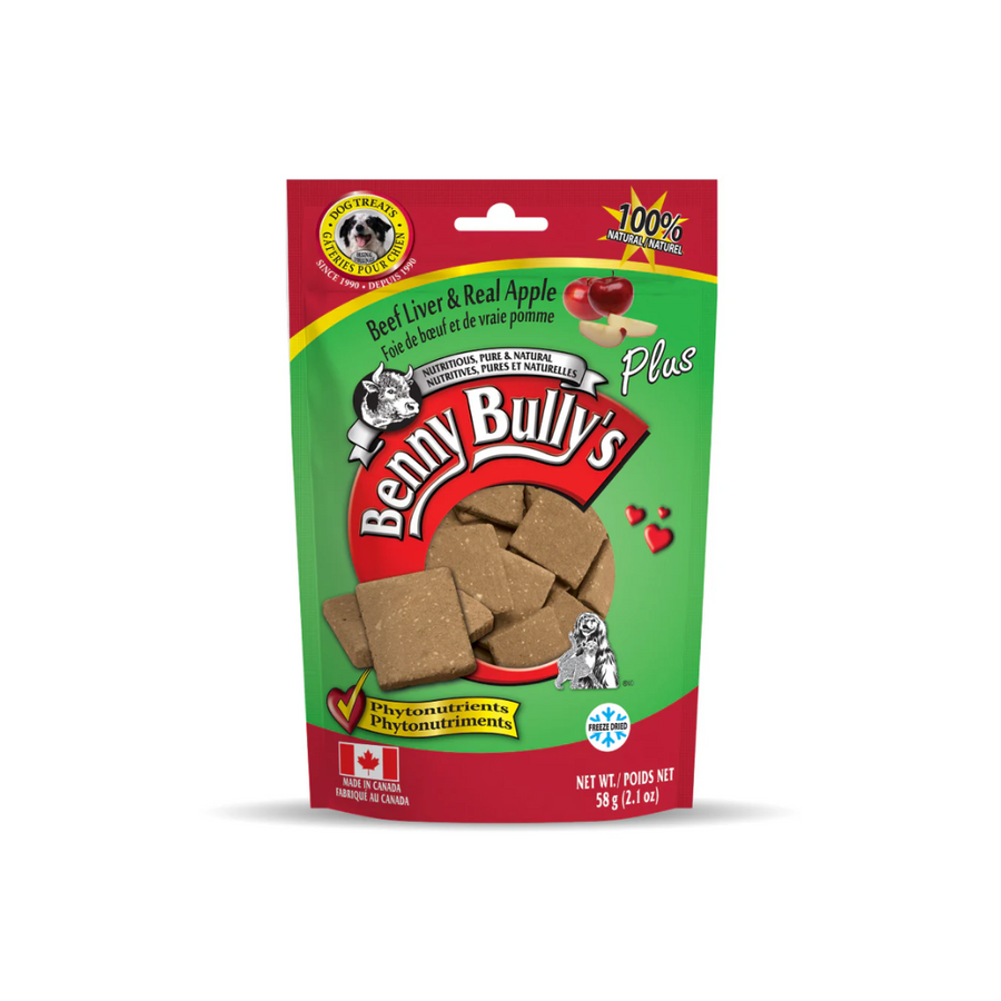 Benny Bully's Freeze Dried Dog Treats Beef Liver Plus Apple combines the goodness of pure beef liver with orchard-fresh apples to create a nutritious treat that supports your dog’s health. Packed with vitamins A and C, fiber, and phytonutrients, these freeze-dried treats are designed to boost your dog's immune system while providing energy throughout the day.