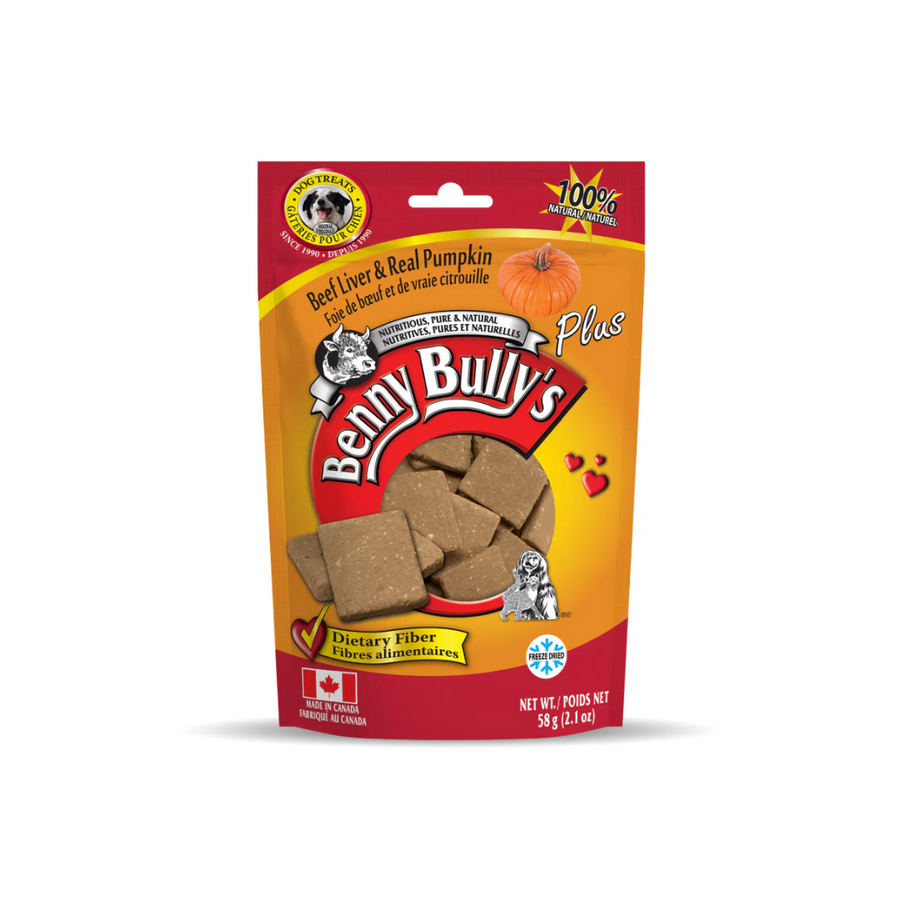 Benny Bully's Freeze Dried Dog Treats Beef Liver Plus Pumpkin combines 100% pure beef liver with pumpkin, offering a nutrient-rich, all-natural treat that supports both gut health and immune function. Freeze-dried to lock in nutrients and flavor, this treat is an ideal way to boost your dog's health with the benefits of iron, vitamins, and fiber.