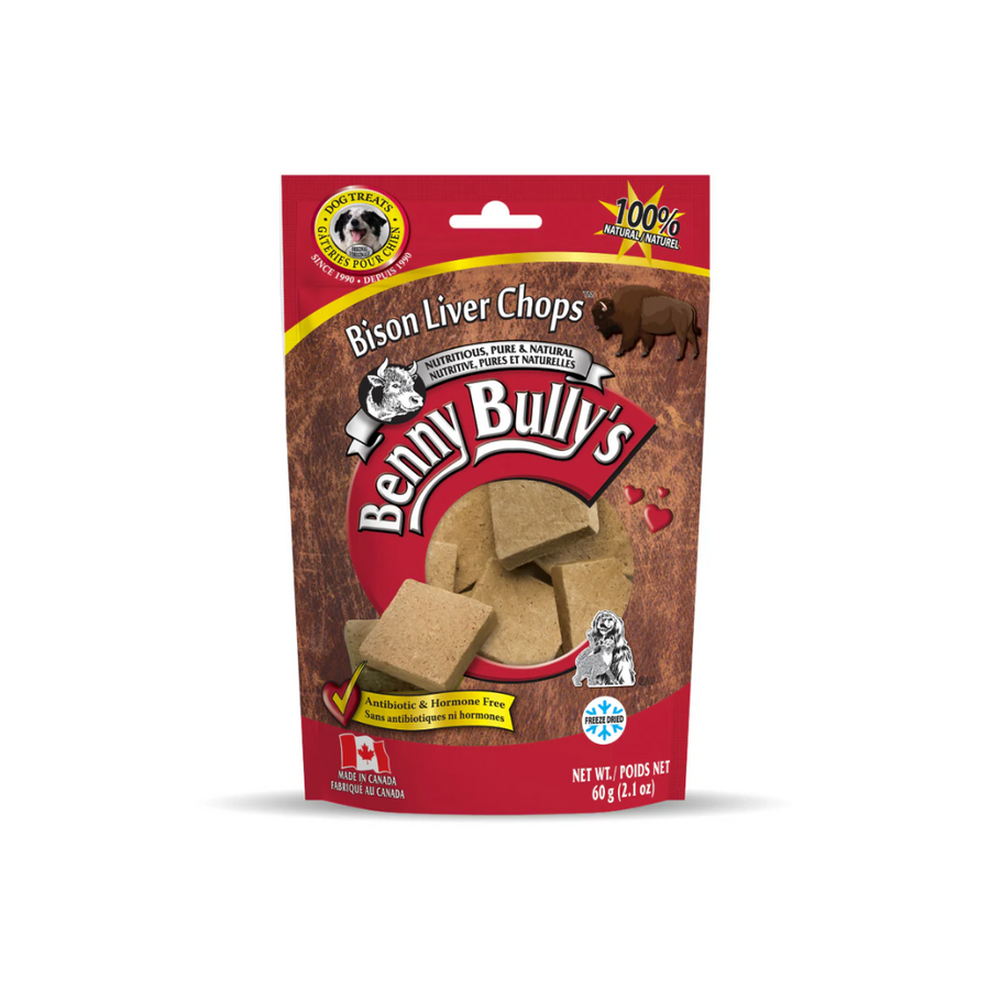 Benny Bully's Freeze Dried Bison Liver Chops are a premium, single-ingredient treat made from pasture-raised, hormone- and antibiotic-free bison liver. Rich in essential vitamins and minerals like A, B6, folate, and iron, these treats are a nutritious alternative protein source ideal for dogs with allergies or sensitivities. Freeze-dried to preserve natural flavor and nutrients, they’re a healthy, high-value reward your dog will love.