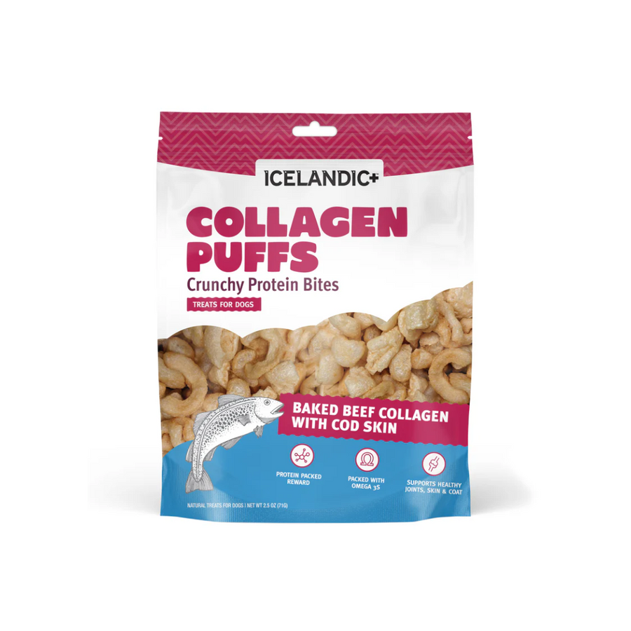 Icelandic+ Beef Collagen Puffs with Cod Skin are the perfect combination of protein-packed nutrition and irresistible crunch. Made with just two premium ingredients—USA-raised beef collagen and sustainably sourced wild-caught cod skin—these light, airy puffs are a delicious, health-conscious treat. High in protein and omega-3s, they help support joint health, skin, coat, and overall vitality. Ideal for medium to large dogs who love a satisfying crunch.
