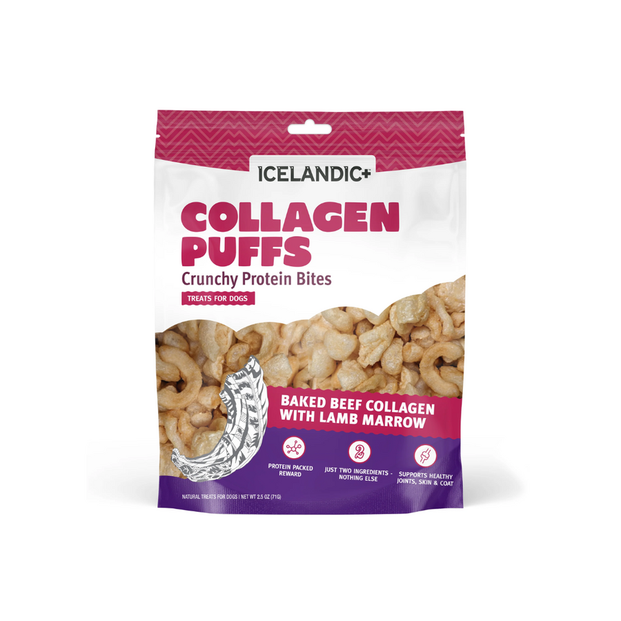 Icelandic+ Beef Collagen Puffs with Marrow are crunchy, all-natural dog treats made with just two nutrient-rich ingredients: USA-raised beef collagen and free-roaming Icelandic lamb marrow. These protein-packed puffs support joint health, skin, and coat while delivering irresistible crunch and flavor. Perfect for medium to large dogs, these low-calorie snacks are ideal for training, rewards, or adventures on the go.