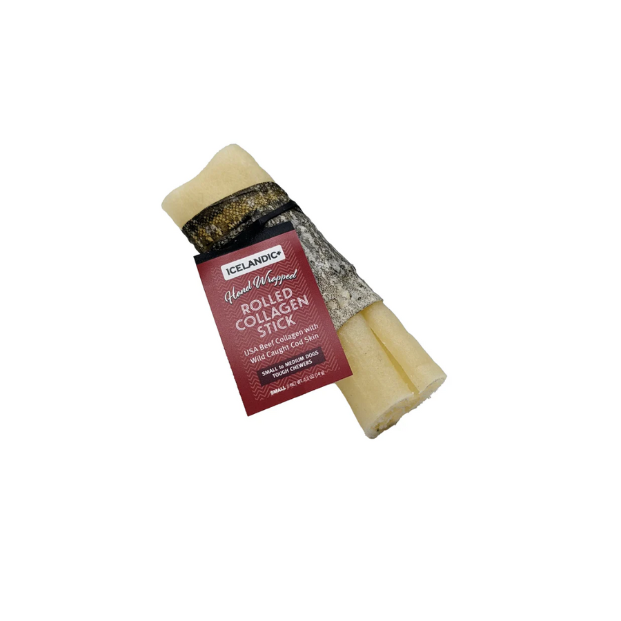 Icelandic+ Rolled Beef Collagen Wrapped With Cod Skin Chew Sticks deliver the ultimate 2-in-1 chewing experience. Made with only two clean ingredients—USA-raised beef collagen and wild-caught Atlantic cod skin—these highly digestible chews are a natural, long-lasting alternative to rawhide. Packed with protein, omega-3 fatty acids, glucosamine, and chondroitin, they promote healthy skin, coat, joints, and dental hygiene. With no chemicals or artificial ingredients, they’re a safe and satisfying treat for dogs of all sizes.