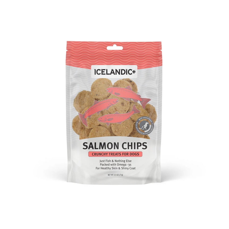 Icelandic+ Salmon Fish Chips are crunchy, protein-rich dog treats made with just two ingredients: sustainably-fished salmon and wild-caught pollock. Air-dried using geothermal energy to preserve nutrients and flavor, these chips are packed with Omega-3 fatty acids to support healthy skin, a shiny coat, and overall vitality. Pure, natural, and delicious—perfect for health-conscious pet parents and their pups.
