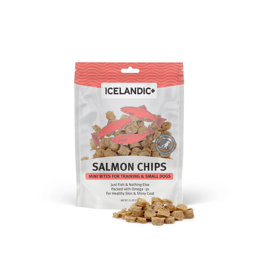 Icelandic+ Mini Salmon Fish Chips are the perfect high-reward, low-calorie treats for training or everyday snacking. Made with just two ingredients—sustainably sourced salmon and wild-caught pollock—these crunchy chips are rich in protein and Omega-3s to support healthy skin, coat, joints, and brain function. Naturally air-dried using Icelandic geothermal energy, they offer clean nutrition with zero fillers, preservatives, or artificial additives.
