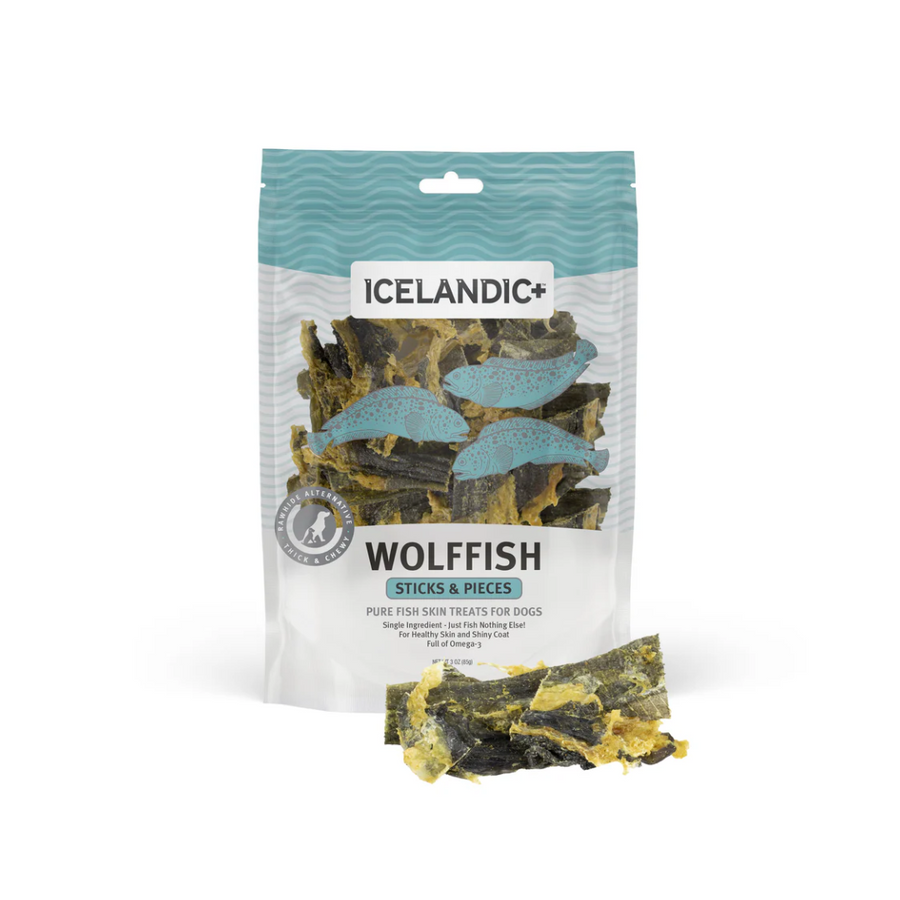Satisfy your pup’s natural chewing instincts with Icelandic+ Wolffish Skin Sticks & Pieces—dense, long-lasting chews made from 100% wild-caught wolffish. Sourced from the pristine, cold waters of Iceland and air-dried using sustainable geothermal energy, these single-ingredient treats are rich in Omega-3 fatty acids, promoting healthy skin, a shiny coat, and overall wellness. Their dense texture also supports dental health by helping reduce plaque and tartar buildup. Perfect for dogs with food sensitivities, these chews are grain-free, additive-free, and completely natural.