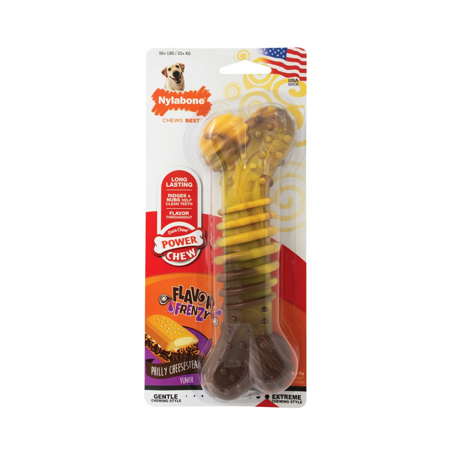 Give your heavy-duty chewer a taste of Philly’s finest—minus the calories! The Nylabone Flavor Frenzy Texture Bone in mouth-watering Philly Cheesesteak flavor is built from ultra-durable nylon to occupy even the most extreme chewers. Raised ridges and grooves satisfy gnawing instincts, scrape away plaque, and freshen breath, while the delicious, calorie-free flavor runs all the way through the Souper-size bone for nonstop tail-wagging fun.