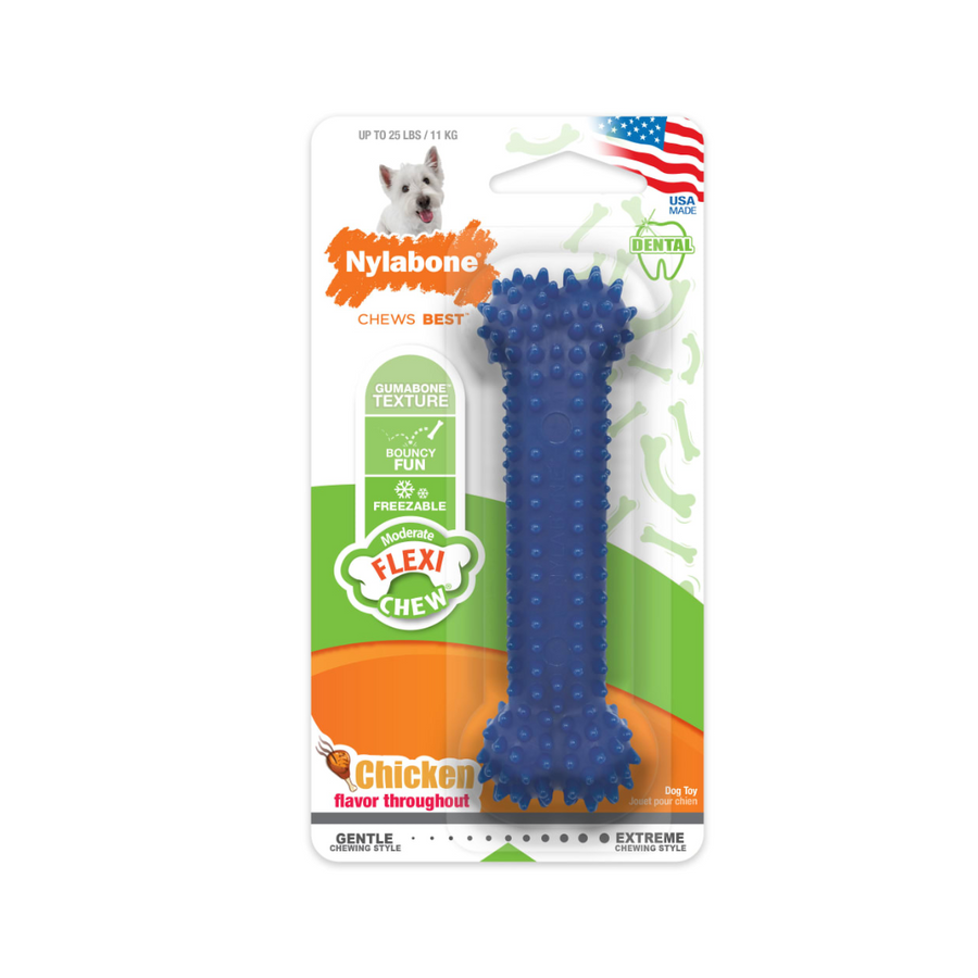 Treat your moderate chewer—especially seniors—to gentle dental care with the Nylabone Flexi Chew Gumabone Textured Dental Bone. Crafted from a bouncy, gummy material that’s kinder to aging teeth, this USA-made bone features all-over cleaning nubs and irresistible chicken flavor to freshen breath, satisfy natural instincts, and keep dogs up to 25 lb happily occupied.