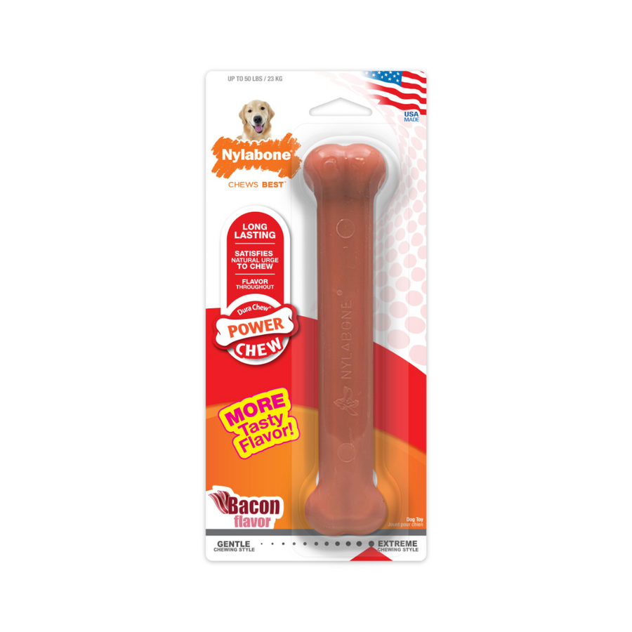 Built for the most determined gnawers, the Nylabone Power Chew Original Bone in irresistible bacon flavor delivers long-lasting satisfaction with zero calories. Crafted from ultra-durable nylon, this USA-made bone helps curb destructive chewing, freshens breath, and keeps dogs up to 50 lb happily occupied with every savory bite.