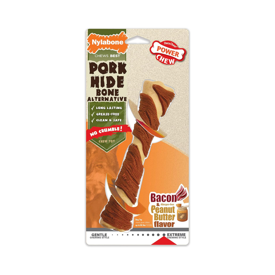 Give your power-chewer the satisfying feel of pork hide—without the mess! The Nylabone Power Chew Pork Hide Bone Alternative is a USA-made, ultra-durable nylon toy shaped like real pork hide but free of grease and crumbling. Infused with mouth-watering bacon & peanut-butter flavor, it keeps dogs up to 50 lb happily occupied, helps reduce destructive chewing, and even supports cleaner teeth with every bite.