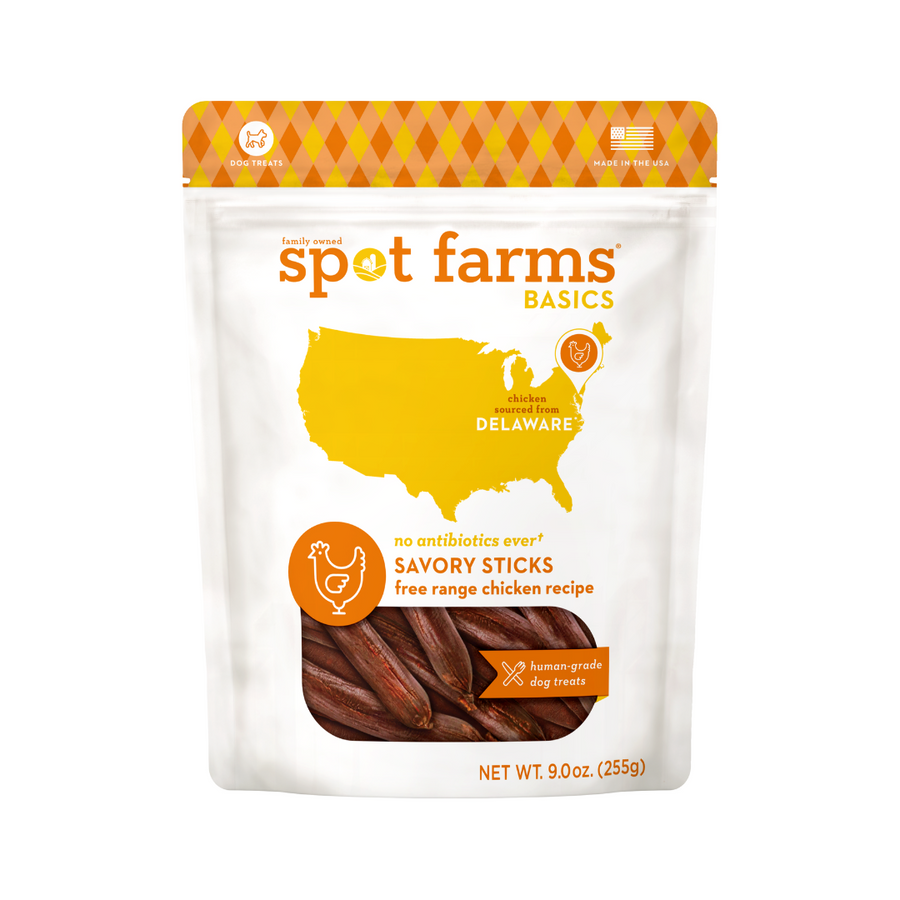 Spot Farms Basics Natural Chicken Sticks are wholesome, chewy jerky treats made with free-range, U.S.-raised chicken and crafted in USDA kitchens using only 100% human grade ingredients. These grain-free, glycerin-free treats are free of by-products, antibiotics, and artificial additives—making them the perfect guilt-free reward for your dog.