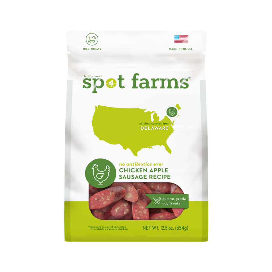 Spot Farms Chicken Apple Sausage Dog Treats are crafted with human-grade, all-natural ingredients sourced from trusted U.S. family farms. Made with antibiotic-free chicken raised in Kentucky and antioxidant-rich apples, these treats are wholesome and nutritious, with a real meat flavor that dogs love. Perfect for training or as a reward, each bite-sized piece is ideal for dogs of all sizes.