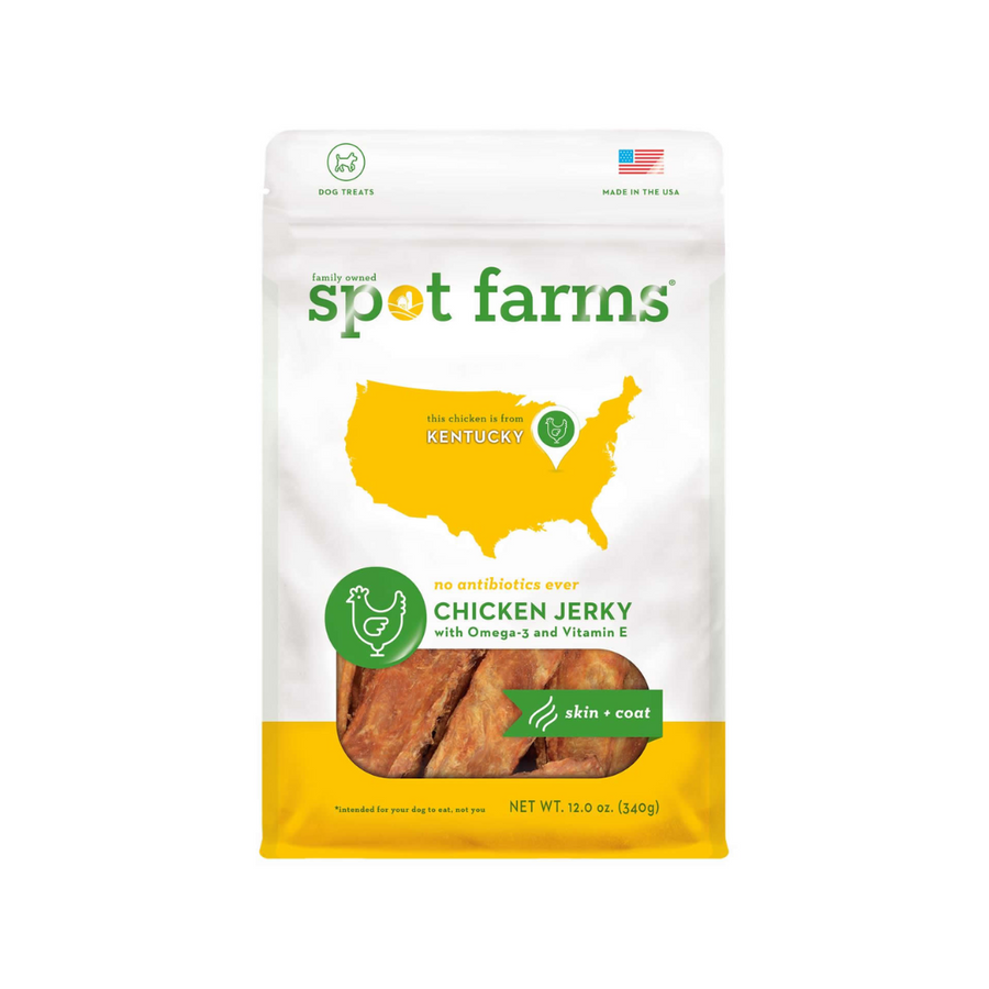 Spot Farms Chicken Jerky Skin + Coat treats offer a functional, all-natural snack designed to support your dog’s skin and coat health. Made with antibiotic-free, US-grown chicken, these treats contain Omega-3 rich flaxseed, brewer’s yeast, and Vitamin E to keep your pet’s coat shiny and skin healthy.