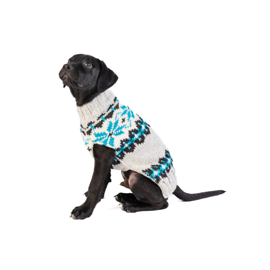 Classic Fair Isle design in icy blues and warm grays, suitable for all dogs