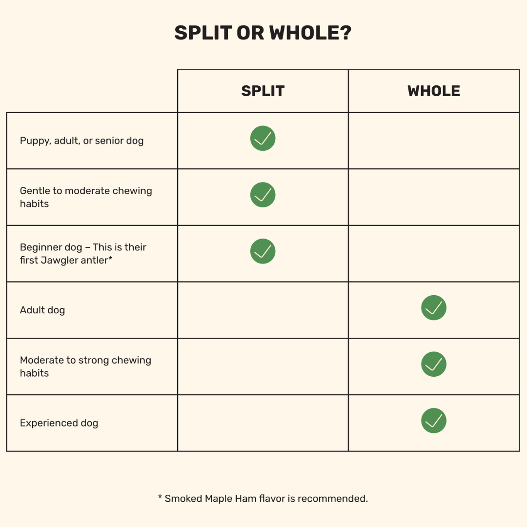 Split: Ideal for puppies, seniors, gentle/moderate chewers, or dogs trying antlers for the first time. (Smoked Maple Ham recommended.)