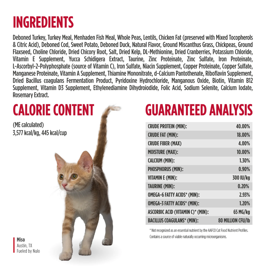 Fuel your cat’s inner athlete with Nulo Freestyle High-Protein Kibble – Turkey & Duck Recipe. This grain-free formula is made with 84% animal-based protein and lower carbs to help maintain lean muscles without excess calories—making it a great fit for growing kittens and adult cats alike. With Omega-3 & Omega-6 for skin and coat, taurine + vitamin A for vision and heart support, and GanedenBC30® probiotics for digestive and immune health, it’s complete and balanced nutrition for every life stage.
