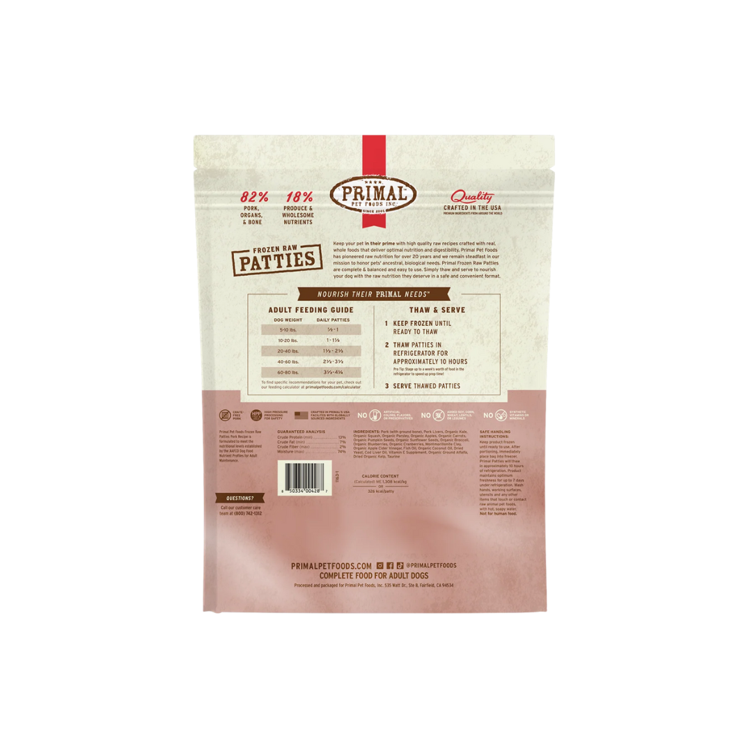 Primal Frozen Dog Food - Canine Raw Frozen Patties Pork Formula offers a complete and balanced raw food diet, perfect for larger dogs or multi-dog households. Crafted with crate-free pork and Certified Organic produce, this frozen formula is designed for easy feeding and optimal nutrition. Available in 6lb resealable bags and 18lb bulk boxes.