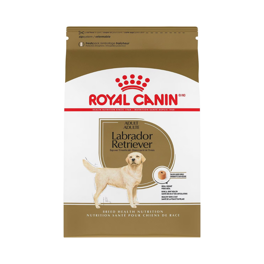 Royal Canin Dry Dog Food - Labrador Retriever Adult is a breed-specific formula designed to meet the nutritional needs of purebred Labradors 15 months and older. This specialized diet supports healthy weight management, bone and joint health, and skin care for large, active Labradors. The unique donut-shaped kibble encourages slower eating, helping fast eaters chew their food thoroughly.