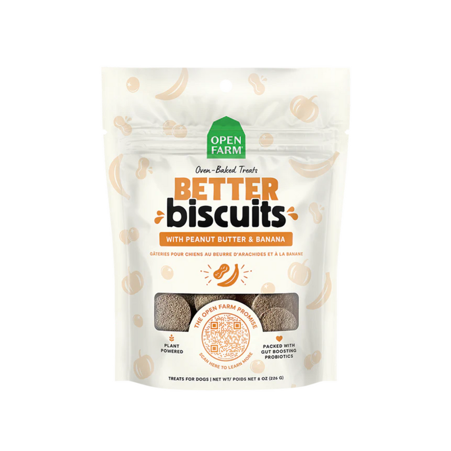 Open Farm Oven Baked Dog Treats - Better Biscuits Peanut Butter & Banana Recipe are delicious, crunchy treats made with peanut butter and banana, combined with superfoods like pumpkin and sweet potato. These oven-baked biscuits are packed with probiotics for gut health and made using non-GMO grains, fruits, and vegetables, making them an irresistible and healthy reward for your dog.